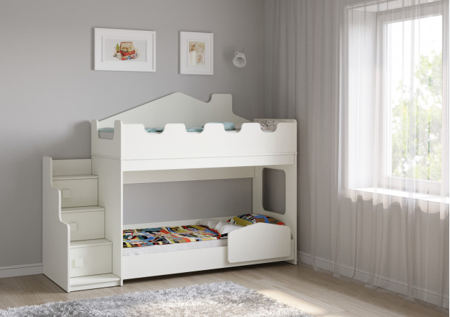 Угловая лестница с тремя дверками обеспечивают легкий и безопасный доступ ко второму этажу и дополнительные места хранения. Нижний ярус оснащен безопасным бортиком – для дополнительного комфорта и безопасности вашего ребенка. Световые окна по бокам создают уютную атмосферу и могут быть использованы для наблюдения за звездами прямо с кровати. Наконец, мягкие углы и кант делают эту кровать безопасной для использования, предотвращая возможность травм.
