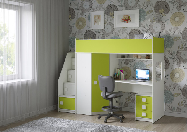 Учебная зона со столом под спальным местом открывает возможности для письменных работ, а также здесь удобно расположить ноутбук. Тумба Л-04 обеспечит хранеие канцелярских принадлежностей и учебников.